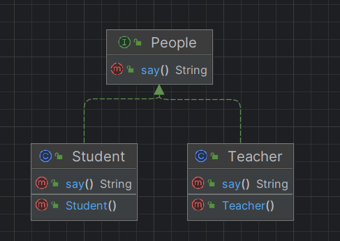 在上方我们定义了三个简单的类,People为接口,内部定义了一个返回String 字符串的方法,Student和Teacher实现了这个接口,并重写了这个方法。