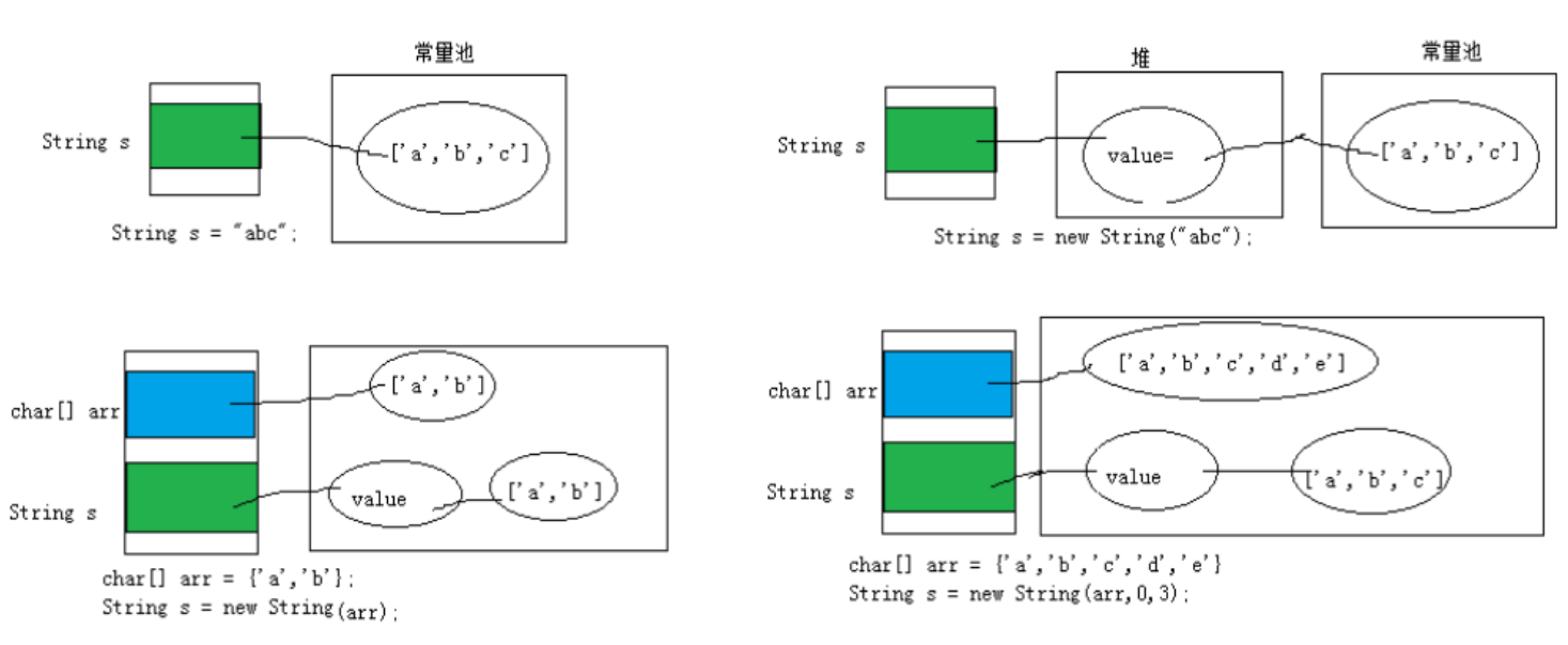 3.String不同实例化方式的对比 1 2 3 4 5 6 7 8 9 10 11 12 String str = "hello" ;String s1 = new String (); String s2 = new String (String original); String s3 = new String (char [] a);String s4 = new String (char [] a,int startIndex,int count);