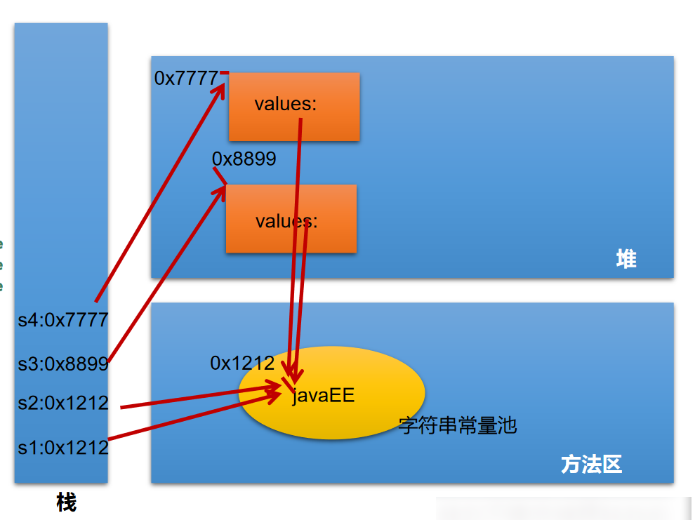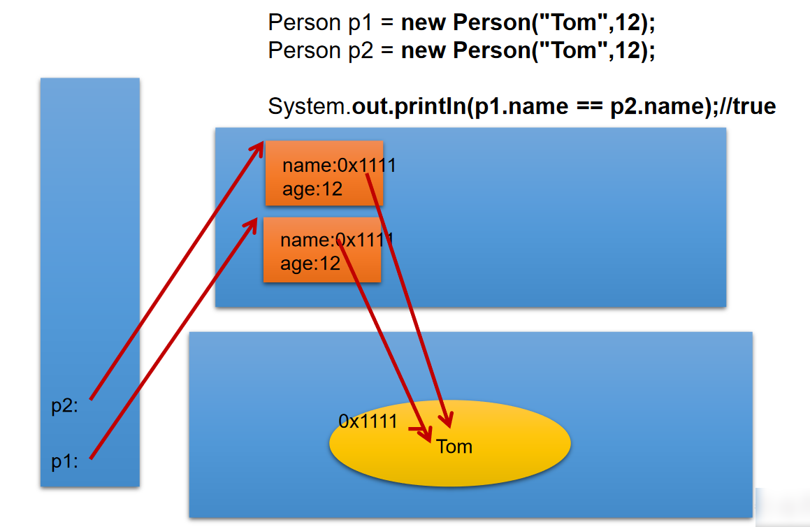 练习 1 2 3 4 5 6 7 8 9 10 11 12 13 14 15 16 17 18 19 20 21 22 23 24 25 26 27 28 29 30 31 32 33 34 35 36 37 38 39 40 import org.junit.Test;public class StringTest { @Test public void test2 () { String s1 = "javaEE" ; String s2 = "javaEE" ; String s3 = new String ("javaEE" ); String s4 = new String ("javaEE" ); System.out.println(s1 == s2); System.out.println(s1 == s3); System.out.println(s1 == s4); System.out.println(s3 == s4); System.out.println("***********************" ); Person p1 = new Person ("Tom" ,12 ); Person p2 = new Person ("Tom" ,12 ); System.out.println(p1.name.equals(p2.name)); System.out.println(p1.name == p2.name); p1.name = "Jerry" ; System.out.println(p2.name); } }