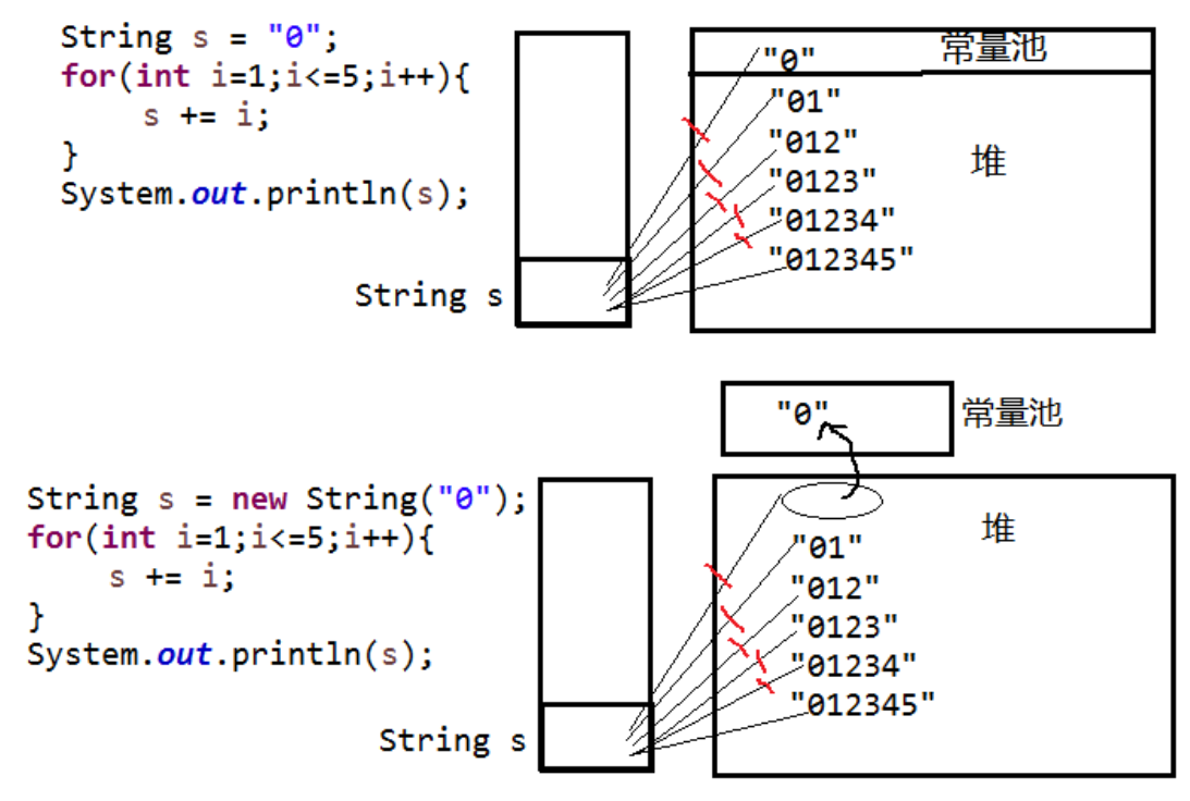 说明:实际上原来的“a”字符串对象已经丢弃了,现在在堆空间中产生了一个字符串s1+”b”(也就是”ab”)。如果多次执行这些改变串内容的操作,会导致大量副本字符串对象存留在内存中,降低效率。如果这样的操作放到循环中,会极大影响程序的性能。